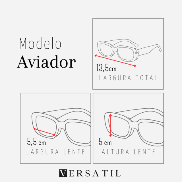 Todos os óculos da Versátil Glasses possuem lentes em policarbonato com proteção UV400, o que protege seus olhos do contato direto com os raios solares UVA e UVB.