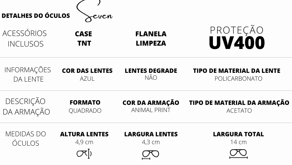 Todos os óculos da Versátil Glasses possuem lentes em policarbonato com proteção UV400, o que protege seus olhos do contato direto com os raios solares UVA e UVB.